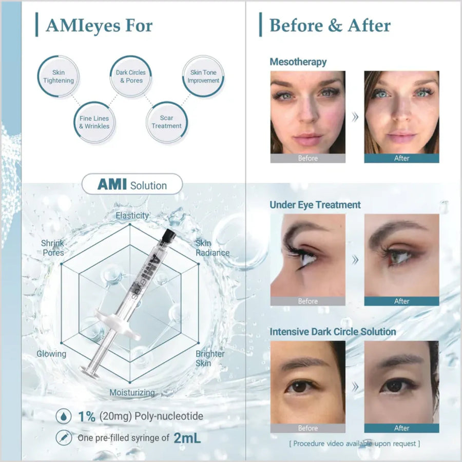 Ami eyes is a premium PN injectable solution that uses tissue regeneration material and refined DNA from salmon silt to restore the conditions of the injured dermis. It is injected in the eyes area or tear valley.